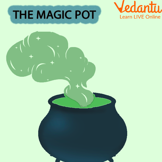 The Magic pot could multiply the things placed in it. First, the farmer, when he discovered the pot, thought of putting some rice in it and using it as a storage container. Later he found out the power of pot. The farmer then filled it with various items, like gold, bread, etc., and became wealthy. When the pot was with the king, he filled the magic pot with several copper coins and soon discovered that it was filled to the brim. Mistakenly the king's father also fell into the pot, and he got two fathers who were the same.