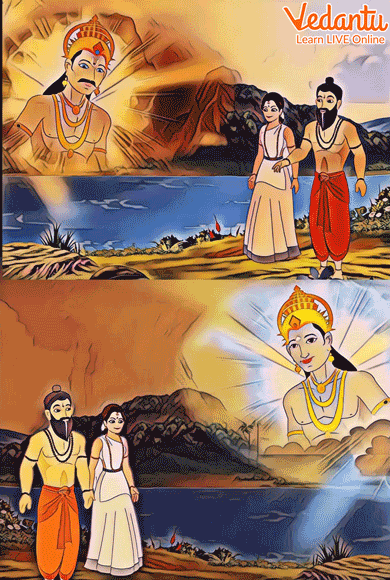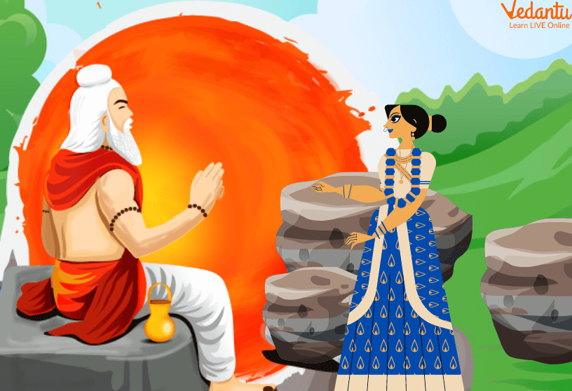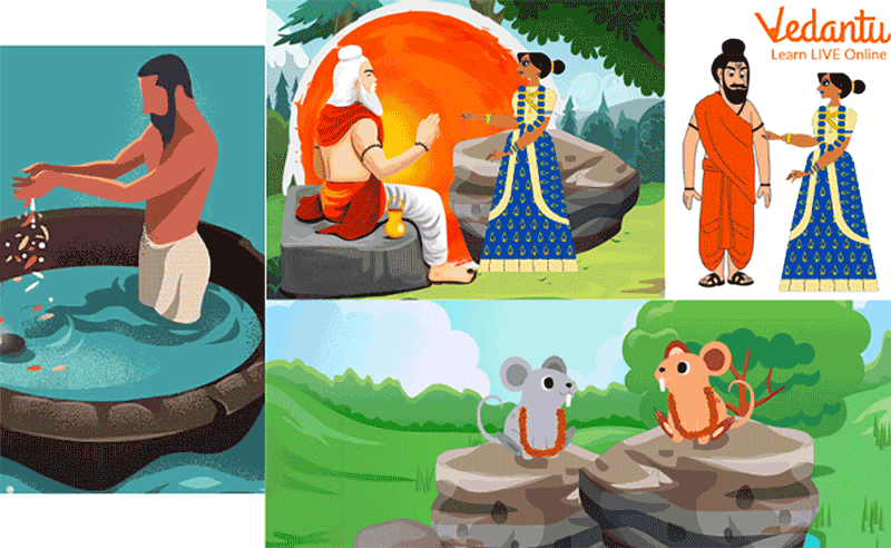 One day when the priest was praying in the Ganges, with his arms stretched open, he felt something on his palms. It was a mouse. It had appeared out of the thin air. When he looked up he saw an eagle and knew that it had dropped the mouse off its beak. He thought that it must be God’s gift and turned it into a beautiful little girl by chanting some ‘mantras’. He then took the little girl home to his wife. When his wife saw the little girl with him she said, “Who is she? Where have you found her?”. The priest told her the whole story and asked her if he should change the little girl back to a mouse. His wife was very happy to see the little girl and thought of raising her as their daughter.