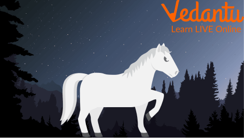 The horse that is described in the story is a beautiful, shining, and white-coloured horse. That beautiful shiny white horse who was carrying bronze armour on his back used to eat the crops on the field at night.