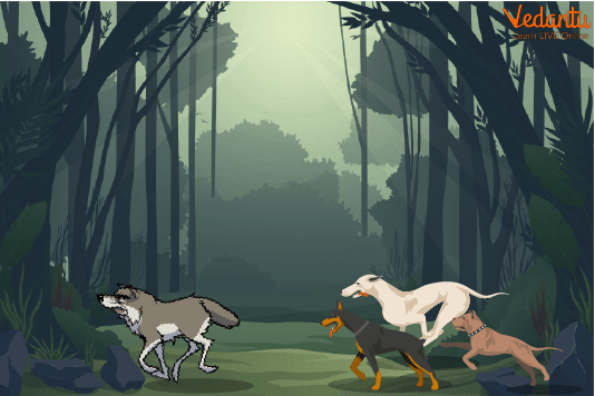 So the wolf struck up a merry tune and the lamb leaped and frisked gaily. Meanwhile, the flock was moving slowly towards its homes. The still air carried the wolf’s piping very far. The shepherd dogs heard the song and recognised the song which the wolf sings before a feast. In no time the dogs came furiously running back to the pasture.
