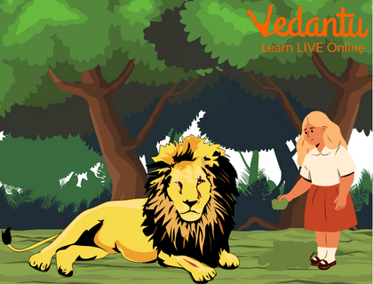 One day, she heard someone moaning in agonizing pain. It was coming from the deep woods. She went there mustering courage and found a lion with a thorn stuck in its paws. She went to the lion and pulled out the thorn. The lion licked her hand and went back.