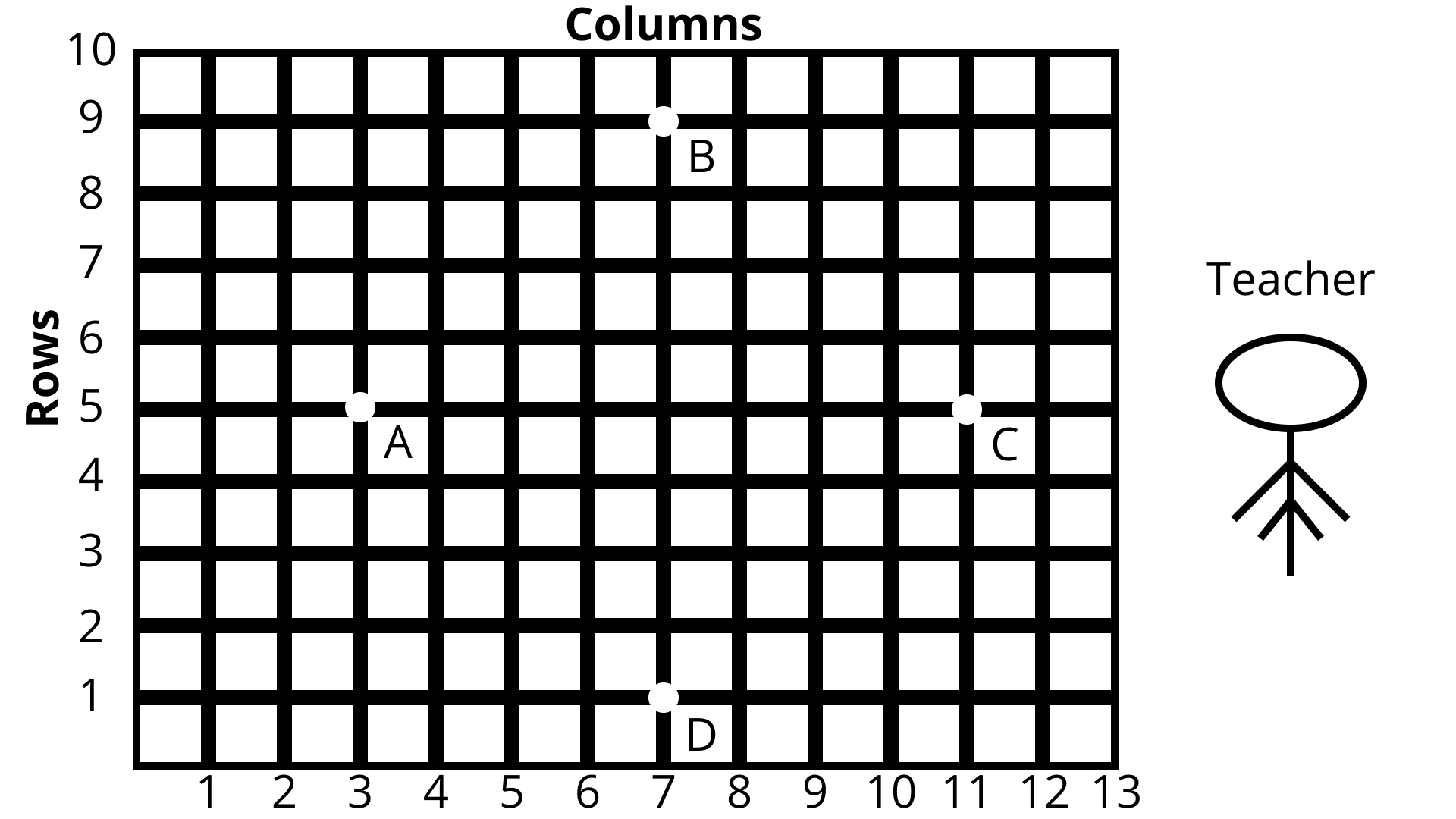 Questions 5: Students of a school are standing in rows and columns in their playground for a drill practice.${\text{A}}$ , $ {\text{B}}$ , $ {\text{C}}$ And ${\text{D}}$ are the positions of four students as shown in figure. Is it possible to place Jaspal in the Drill in such a way that he is equidistant from each of the four students ${\text{A}},{\text{B}},{\text{C}}$ and ${\text{D}}$ ? If so, what? Should be his position?