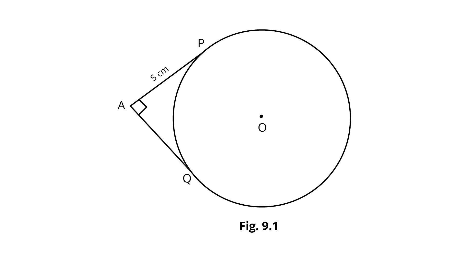 2. In Fig. 9.1, the pair of Tangents $AP$ and $AQ$ drawn from an external point $A$ to a circle with centre $O$ are perpendicular to each other and length of each tangent is $5cm$. Then the radius of the circle is