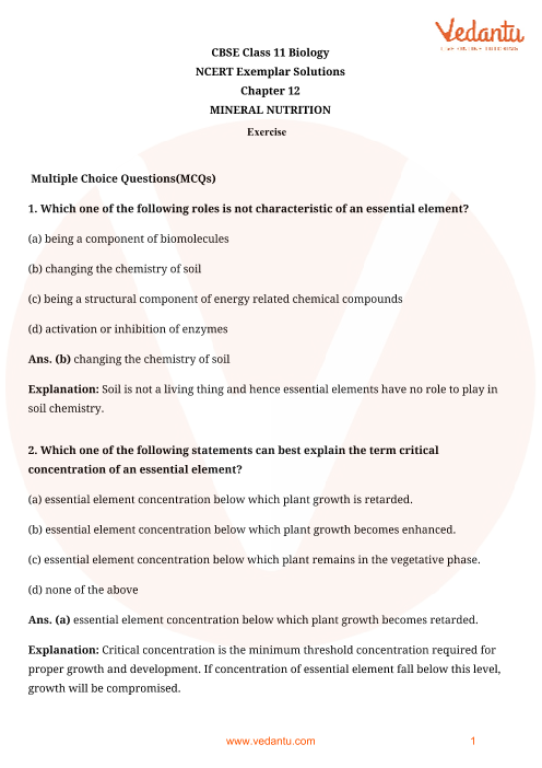 Preparing a Chapter like Mineral Nutrition to which the Class 11 students are new is something that should be done with serious discipline. The students should read every line with proper attention and should highlight the important notes. After this, they should try to solve the questions of NCERT and NCERT Exemplar for Class 11 Biology. They should study this chapter well as this chapter is also important for competitive exams like NEET, etc. Vedantu makes sure each child does that with our NCERT Exemplar for Class 11 Biology Chapter-12 (Book Solutions).