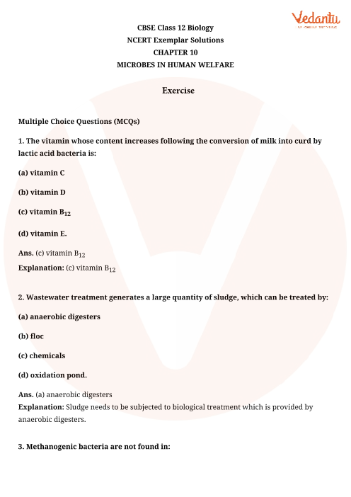 Free PDF download of NCERT Exemplar for Class 12 Biology Chapter 10 - Microbes in Human Welfare solved by expert Biology teachers on Vedantu.com as per NCERT (CBSE) Book guidelines. All Chapter 10 - Microbes in Human Welfare exercise questions with solutions to help you to revise the complete syllabus and score more marks in your examinations.