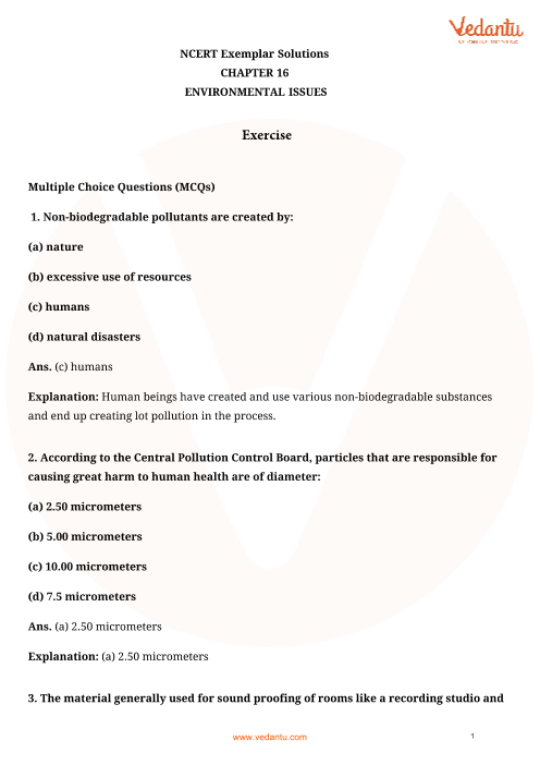 The NCERT Exemplar for Class 12 Biology Chapter 16 - Environmental Issues (Book Solutions) contains all types of questions you need to practice for revision. There are MCQs, very short answer type, short answer type, and long answer type questions with detailed answers. The answers to MCQ are also available with their explanations to help you understand why a particular option is correct. These answers will not only help you revise Chapter 16 but will also provide you with a plethora of questions that may come in your board Exam.