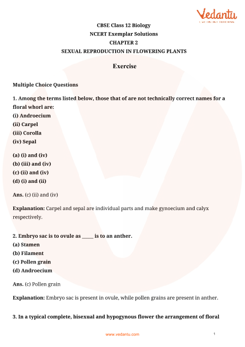 Free PDF download of NCERT Exemplar for Class 12 Biology Chapter 2 - Sexual Reproduction in Flowering Plants solved by expert Biology teachers on Vedantu.com as per NCERT (CBSE) Book guidelines. All Chapter 2 - Sexual Reproduction in Flowering Plants Exercise questions with solutions to help you to revise complete syllabus and score more marks in your Examinations.
