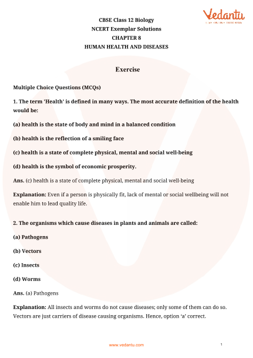 NCERT Solutions by Vedantu for Class 12 Biology Chapter 8 Human Health and Diseases presents solutions for all of the textbook questions appearing in the Class 12 textbook. The NCERT Solutions for Class 12 Biology is available in a PDF format so that students can download and seek advice from these answers at their comfort and study through them. These solutions are updated on a regular basis for you with CBSE Syllabus 2024-25 and also they can be used to put together good notes that can be used throughout the revisions.