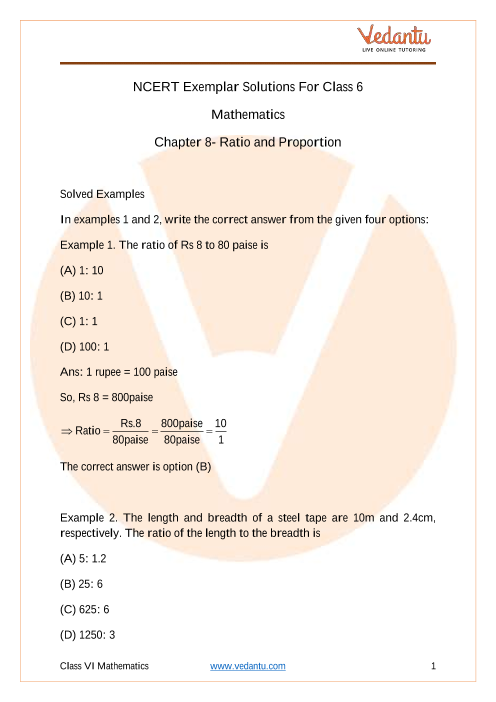 Free PDF download of NCERT Exemplar for Class 6 Maths Chapter 8 Ratio & Proportion solved by expert Maths teachers on Vedantu as per NCERT (CBSE) Book guidelines. All Chapter 8 Ratio & Proportion exercise questions with solutions will help you to revise and complete the syllabus and score more marks in your examinations.