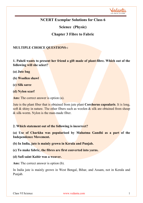 NCERT Exemplar for Class 6 Science Chapter 3 Fibre to Fabric is actually a great asset for the students of class 6. They can not only find all the necessary questions in it but also the solutions, with the help of Vedantu. Students can also gather a good understanding which will help them thoroughly at the time of their tests and exams. These have some of the questions framed in a fun way that makes it very easy to retain all the information.