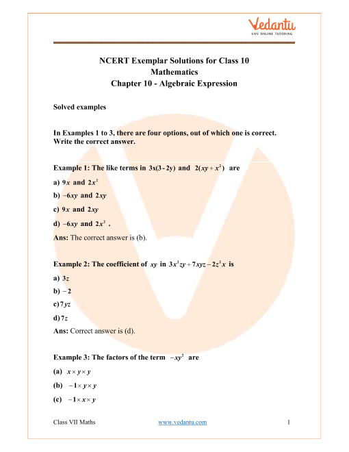 You can find NCERT Exemplar for Class 7 Maths Chapter - 10 Algebraic Expressions on the Vedantu app or website. You can find the NCERT Exemplar for Class 7 Maths Chapter - 10 Algebraic Expressions on the Vedantu site through the mentioned link