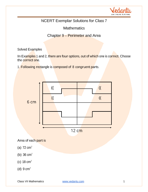 Vedantu offers the NCERT Exemplar for Class 7 Maths Solutions Chapter - 9 Perimeter & Area to the students which are completely free of cost. This NCERT Exemplar for Class 7 Maths Solutions Chapter - 9 Perimeter & Area is provided in PDF format, which can be downloaded by the students to study offline.