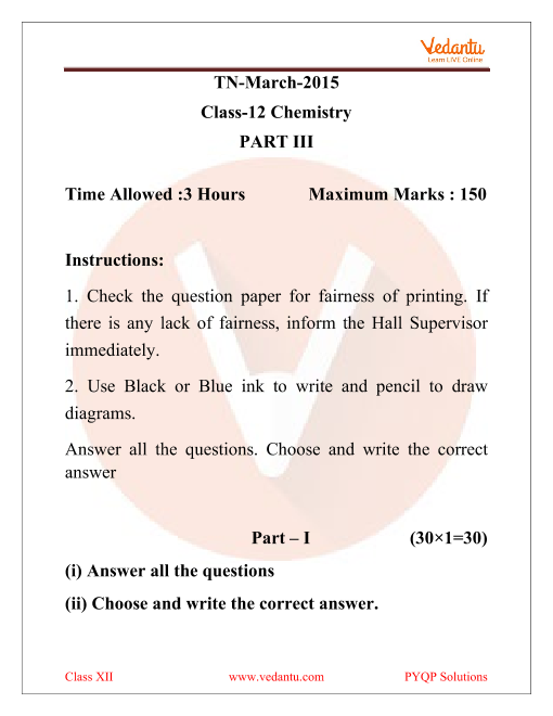 Students can easily access TN Board Previous Year Question Paper for Class 12 Chemistry 2015 in pdf form from various websites of education and one of them is the Vedantu website which not only provides study material including notes related to student classes and chapters, modal test papers, practice questions, online video sessions regarding different chapters, and also previous year question paper for the different board including TN board.